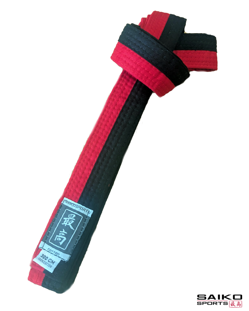 Der Saiko Sports schwarz-rote Gürtel aus 100% Baumwolle zeichnet sich besonders durch intensiv leuchtende Farben aus. Junior-Dan-Grade werden so gekennzeichnet.