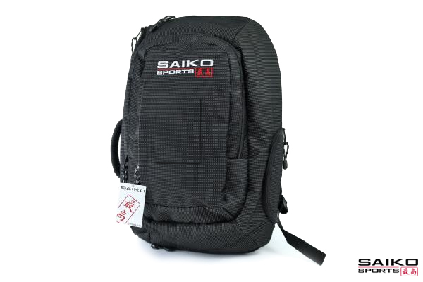 Der SaikoSports-Rucksack ist aus einem sehr strapazierfähigen und wasserfesten Material aus Kunstfaser. Geräumig und doch sehr handlich ist er ein vielseitiger Begleiter für die Freizeit. Ein DIN A4-Ordner taugliches Hauptfach bietet Platz für den Gi und einiges mehr.