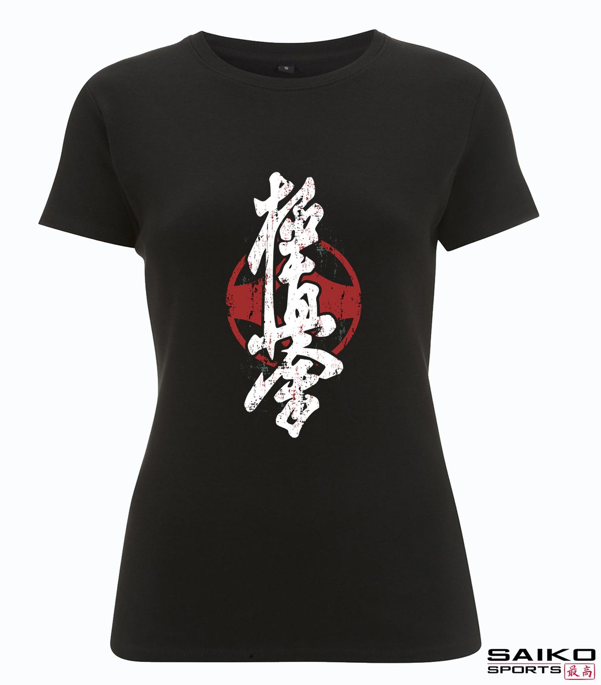 Farbige Kyokushin Logo-Kalligraphie auf schwarzem T-Shirt. Zeige DEINEN Stil!