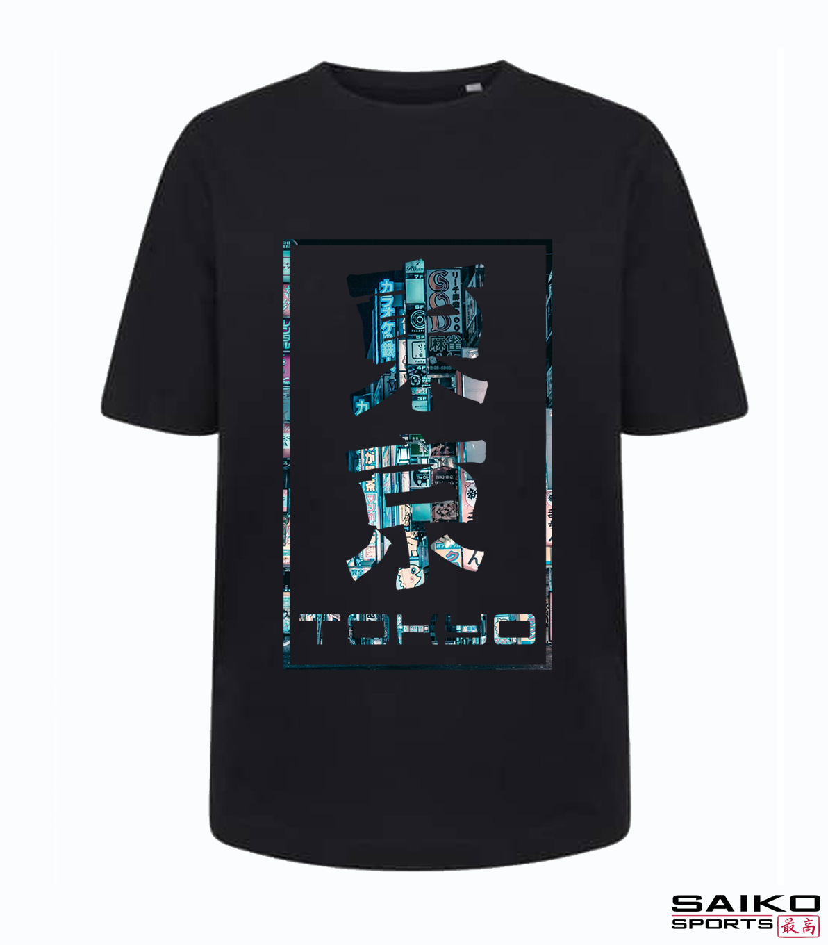 Oversize T-Shirt aus 100% Baumwolle mit Tokyo City Motiv und Kanji, sowie kleinem Logo-Druck am Ärmel, designed by SaikoSports.